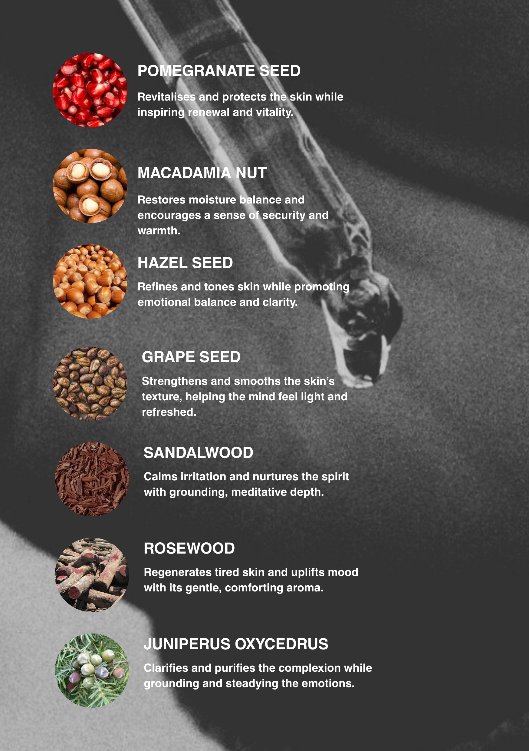 Prunus Amygdalus Dulcis (Sweet Almond) Oil, Camellia Oleifera (Camellia) Seed Oil, Punica Granatum (Pomegranate) Seed Oil, Macadamia Ternifolia Seed Oil, Corylus Avellana (Hazel) Seed Oil, Vitis Vinifera (Grape) Seed Oil, Santalum Album (Sandalwood) Oil, Aniba Rosaeodora Wood Oil, Linalool, Juniperus Oxycedrus Wood Oil, Daucus Carota Sativa (Carrot) Seed Oil, Carum Petroselinum Seed Oil
